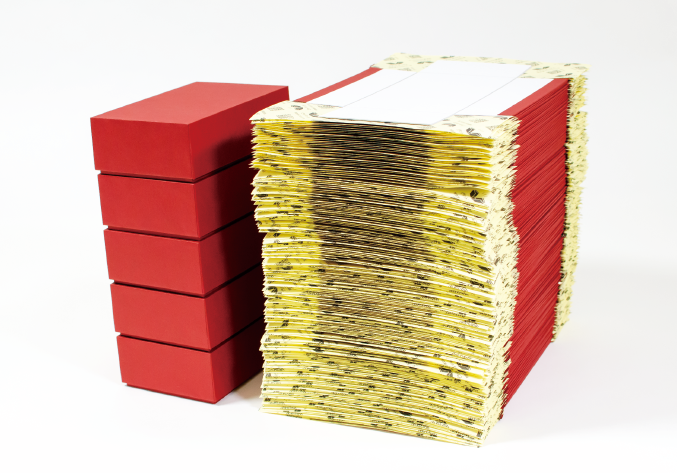 通常の貼り箱5ヶとピタットボックス®100ヶの比較写真です。